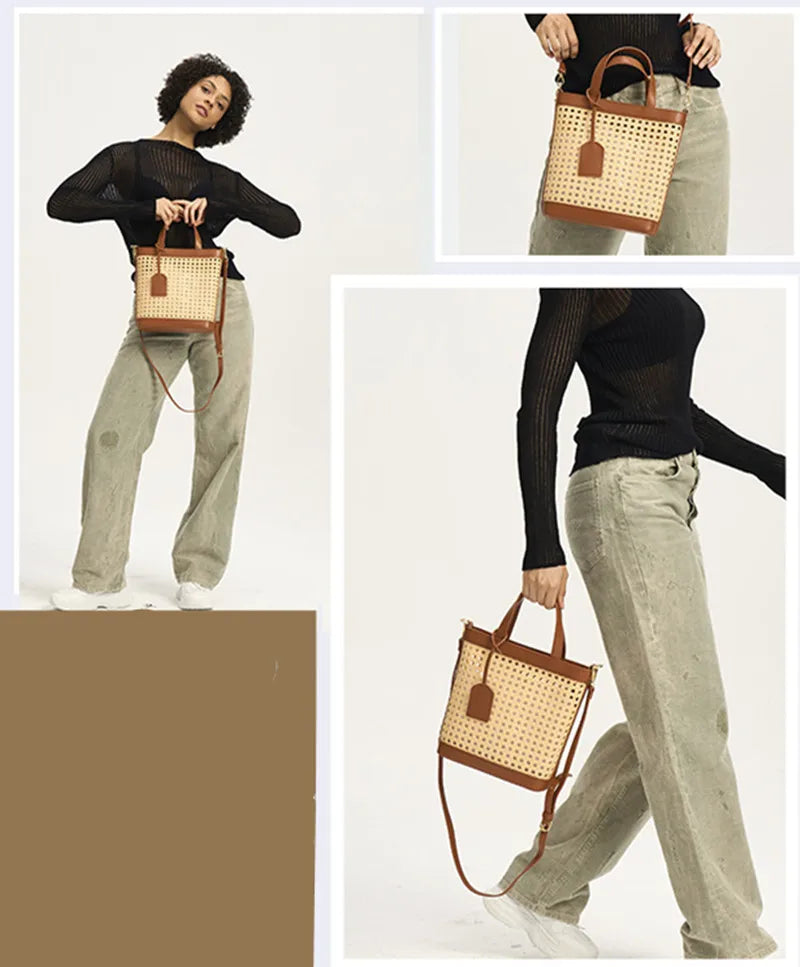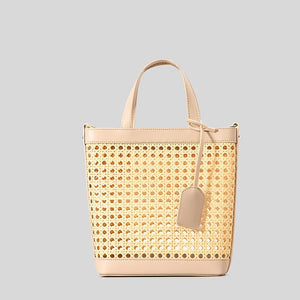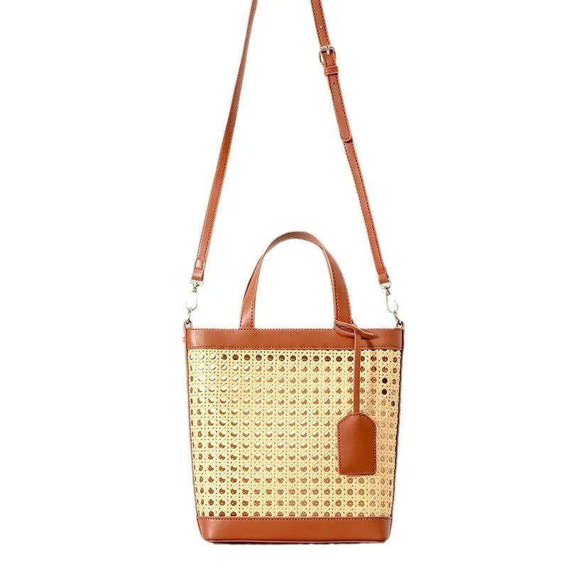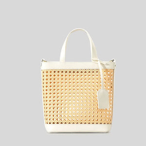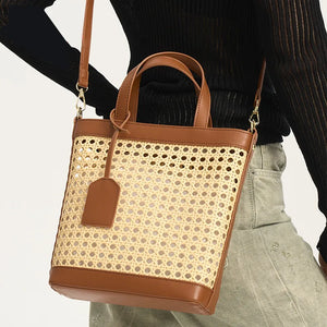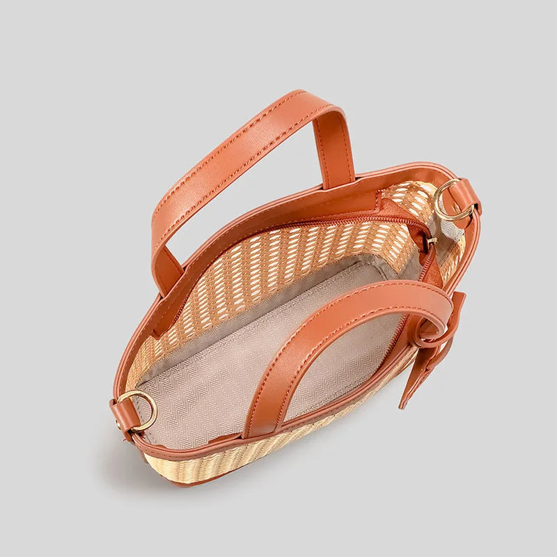 The Capri Woven Tote captures the essence of timeless Mediterranean style with a modern edge. Featuring a structured silhouette crafted from handwoven rattan-inspired material and elevated with smooth faux-leather trim, this bag is designed for effortless elegance.