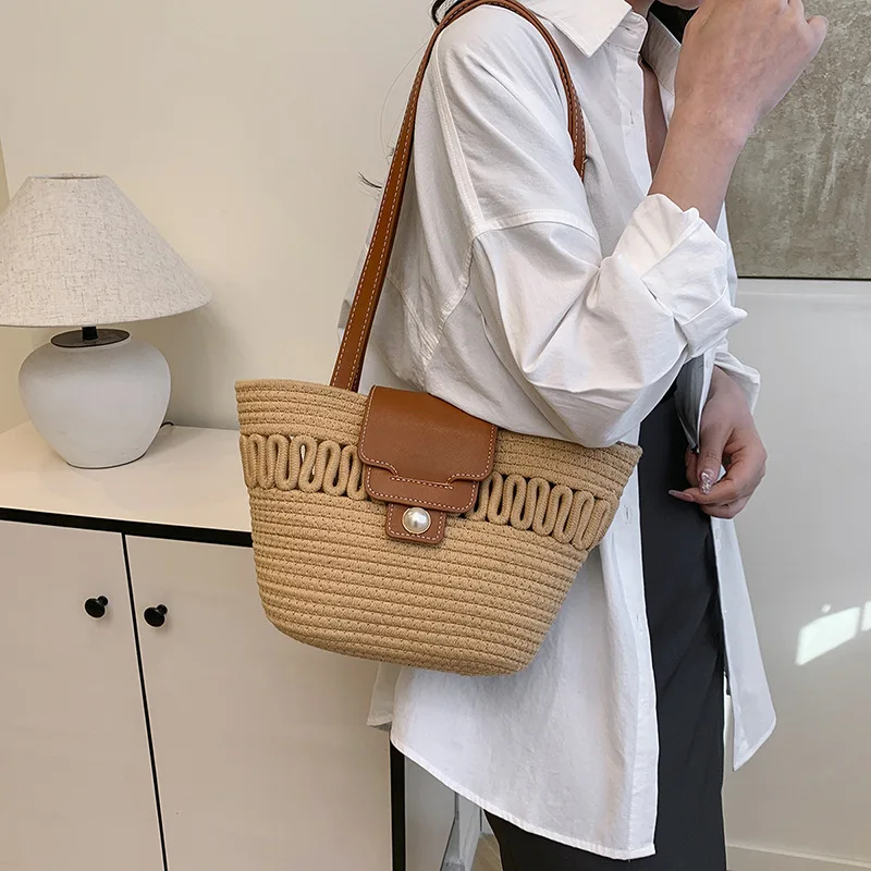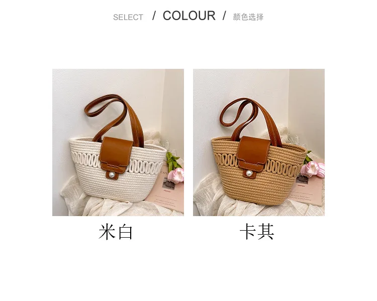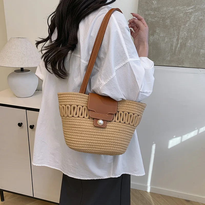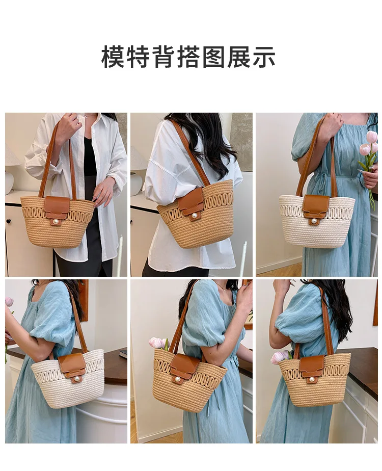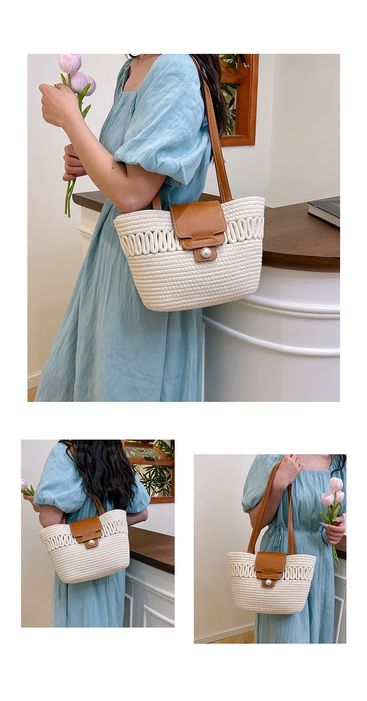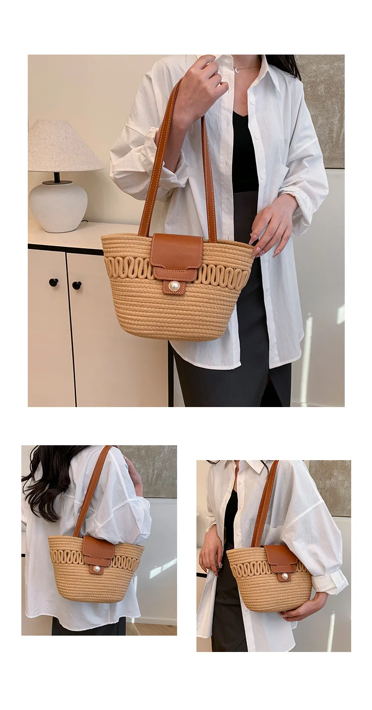 Its spacious interior offers ample room for all your daily essentials, while the structured silhouette maintains a polished appearance, whether you're at the beach, commuting to work, or enjoying a casual day out. The blend of contemporary design and natural texture captures the essence of warm-weather sophistication, making it a timeless accessory that complements every outfit in your seasonal wardrobe.
