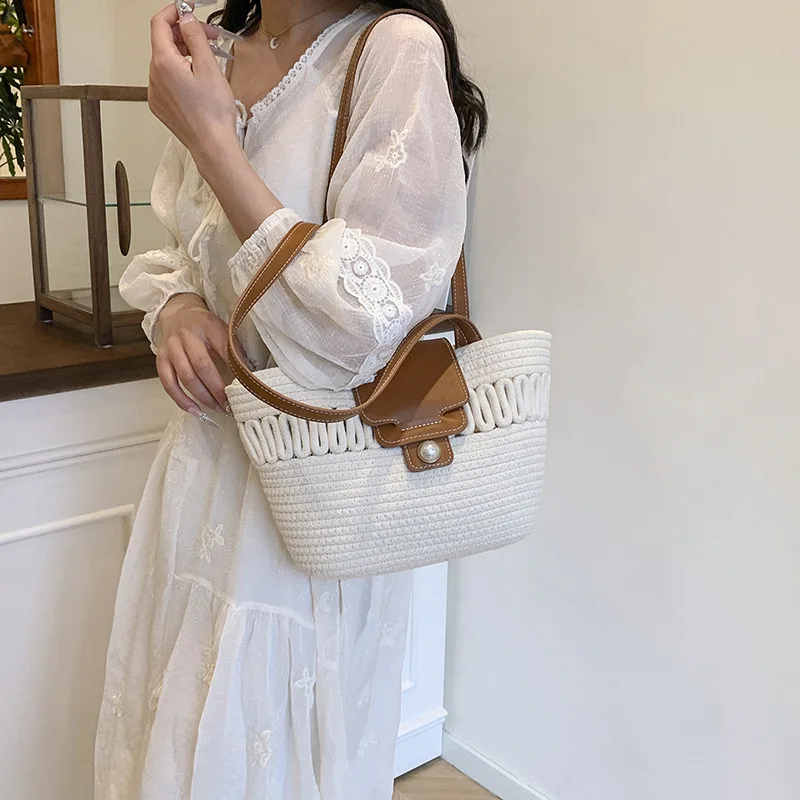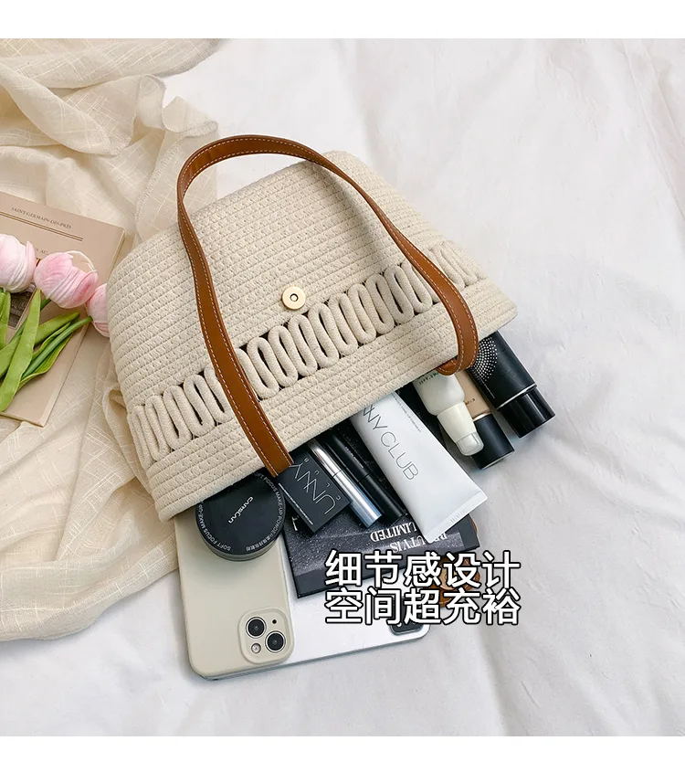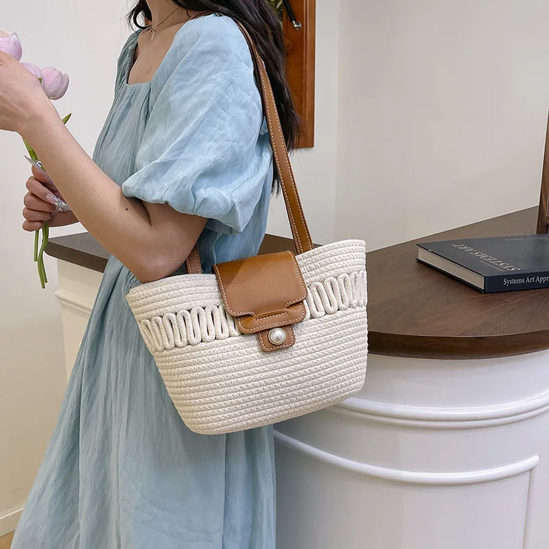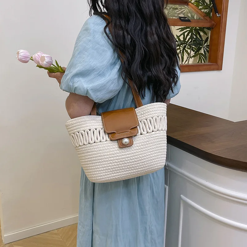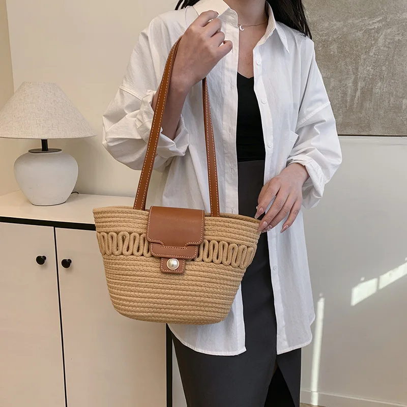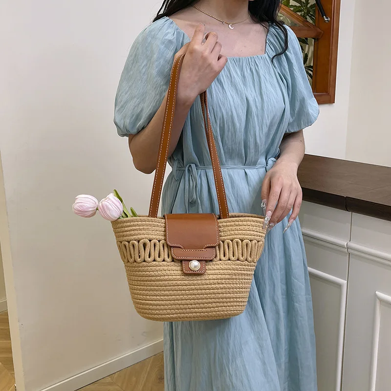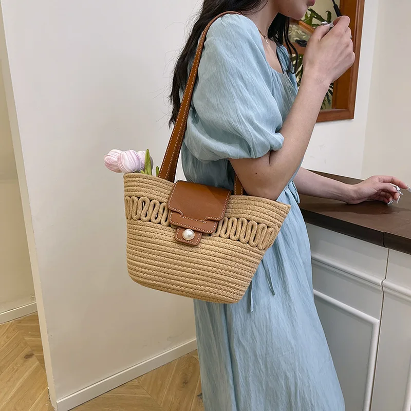 Its spacious interior offers ample room for all your daily essentials, while the structured silhouette maintains a polished appearance, whether you're at the beach, commuting to work, or enjoying a casual day out. The blend of contemporary design and natural texture captures the essence of warm-weather sophistication, making it a timeless accessory that complements every outfit in your seasonal wardrobe.
