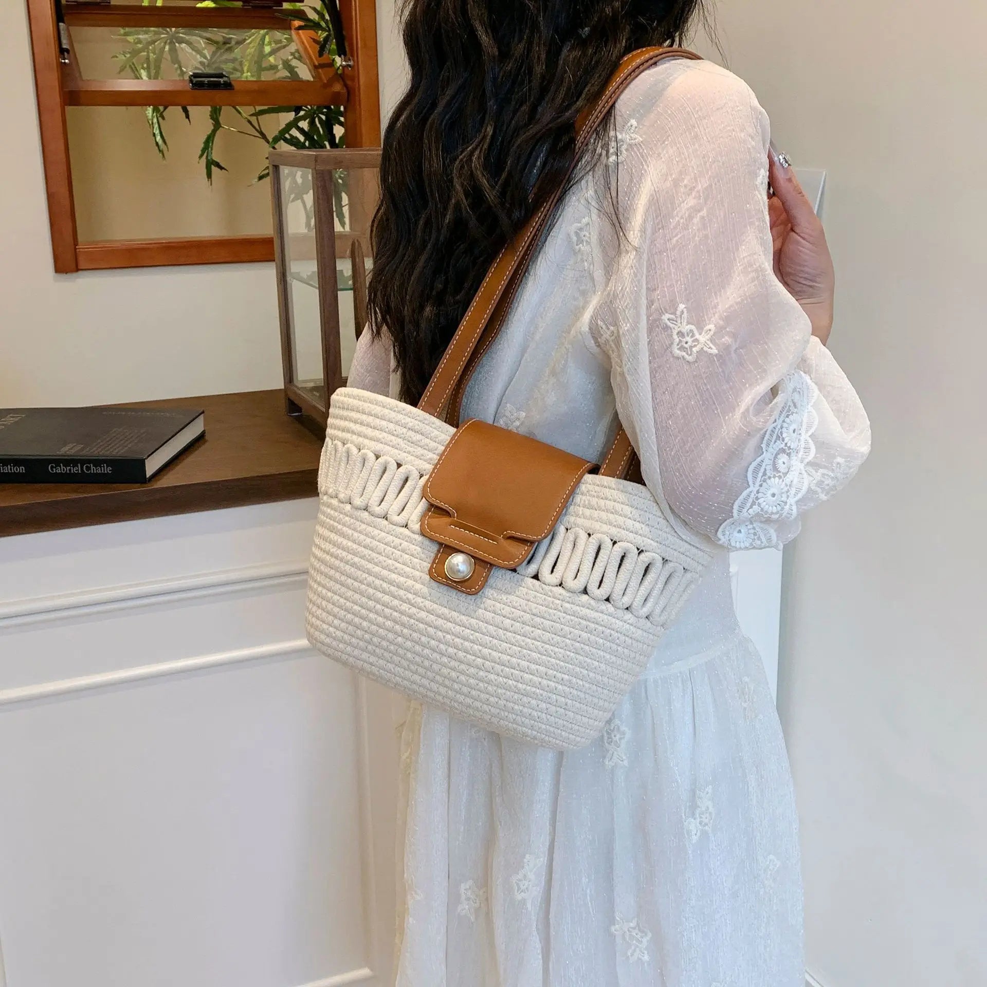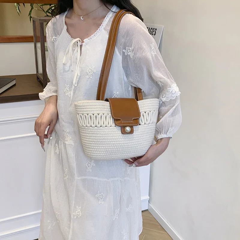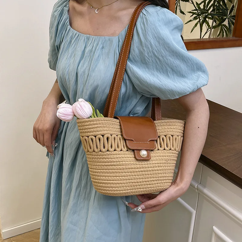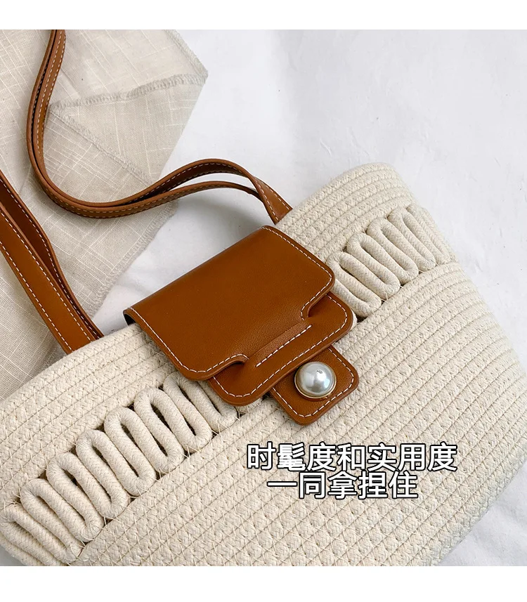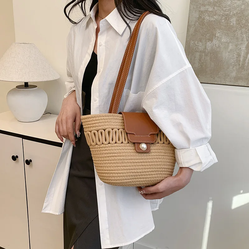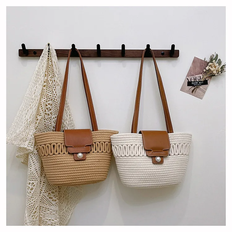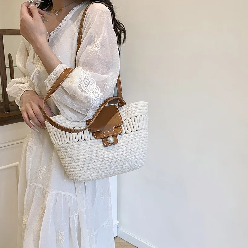 Its spacious interior offers ample room for all your daily essentials, while the structured silhouette maintains a polished appearance, whether you're at the beach, commuting to work, or enjoying a casual day out. The blend of contemporary design and natural texture captures the essence of warm-weather sophistication, making it a timeless accessory that complements every outfit in your seasonal wardrobe.